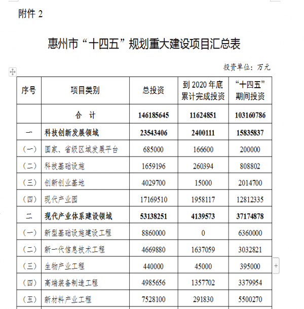 6月3日,惠州市政府正式對外公布《惠州市國民經(jīng)濟和社會發(fā)展第十四個五年規(guī)劃和2035年遠景目標綱要》(下稱《綱要》)。其中明確提出,“十四五”期間規(guī)劃建設重大項目312宗,計劃總投資近1.5萬億元,“十四五”期間計劃投資10316億元。